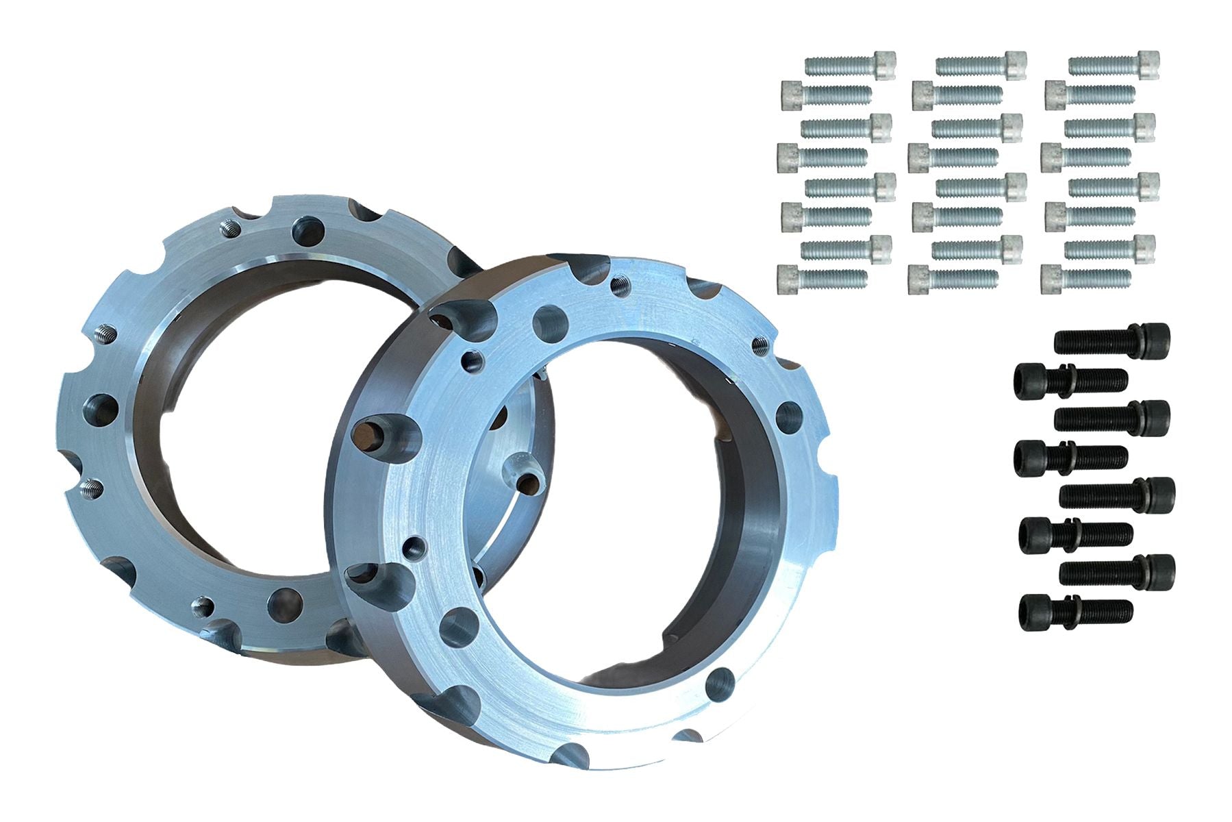 Can also be used to bolt a 2005+ Super Duty Unit Bearing to a modified 2 1/2 ton Rockwell knuckle. This would give you 8 x 6.5 bolt pattern. Requires the use of RCV shafts.