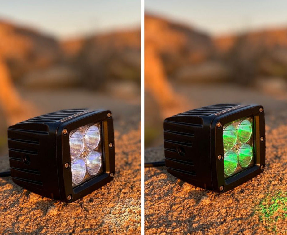 These are sold as a single pod. Green is the best application to cut thru dust. Some race organizations require a green rear facing light for limited class race vehicles. This also has white light so you can switch between both.