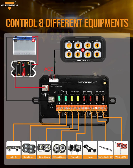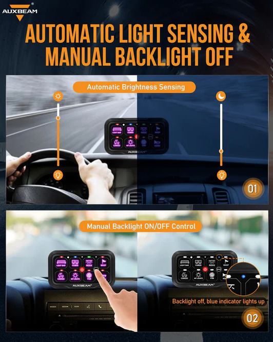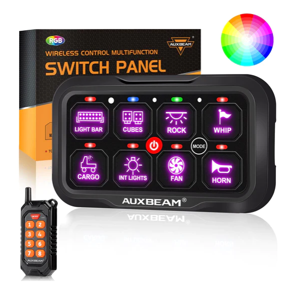 - 8-Gang one-sided outlet switch panel. It allows you to control up to 8 different LED lights or devices. Command all your vehicle accessories by the tap of your finger.