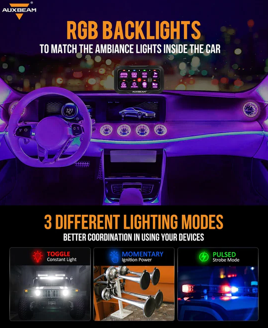 ✔ RGB Backlight - Unlimited color options match dash lighting and vehicle