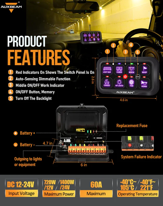 - Premium Made. Auxbeam switch panel extension boasts an especially thick hard wire, which not only enhances its strength and longevity, but also provides superior protection against EMI and RF interference, including automotive circuit interference